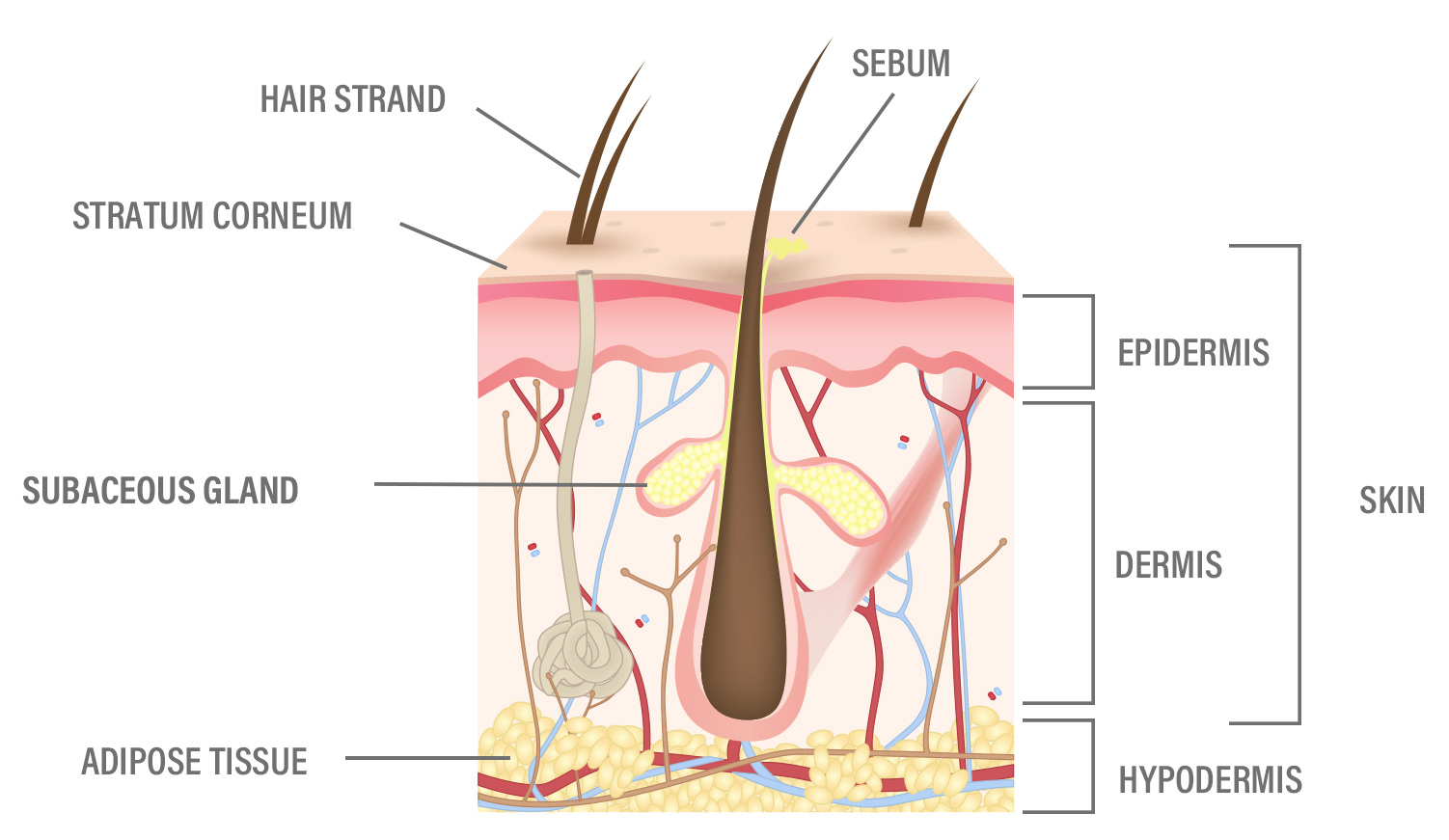 Sebaceous glands produce the “oil” on our skin called sebum. These tiny skin glands surround and empty into the same pores that hair follicles exit from. The face and scalp have a high density of sebaceous glands, and therefore produce more sebum, compared to other areas of the body.